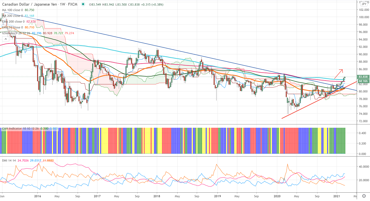 CADJPY is trading higher for a fifth consecutive week and surged more than 300 pips. The upbeat market sentiment and surge in the oil price are supporting the Canadian dollar at lower levels. The Canadian retail sales came at -4.1% in December compared to a forecast of -2.4%. WTI crude recovered slightly after hitting five days low. The short-term trend of CADJPY is bullish as long as support 83 holds.