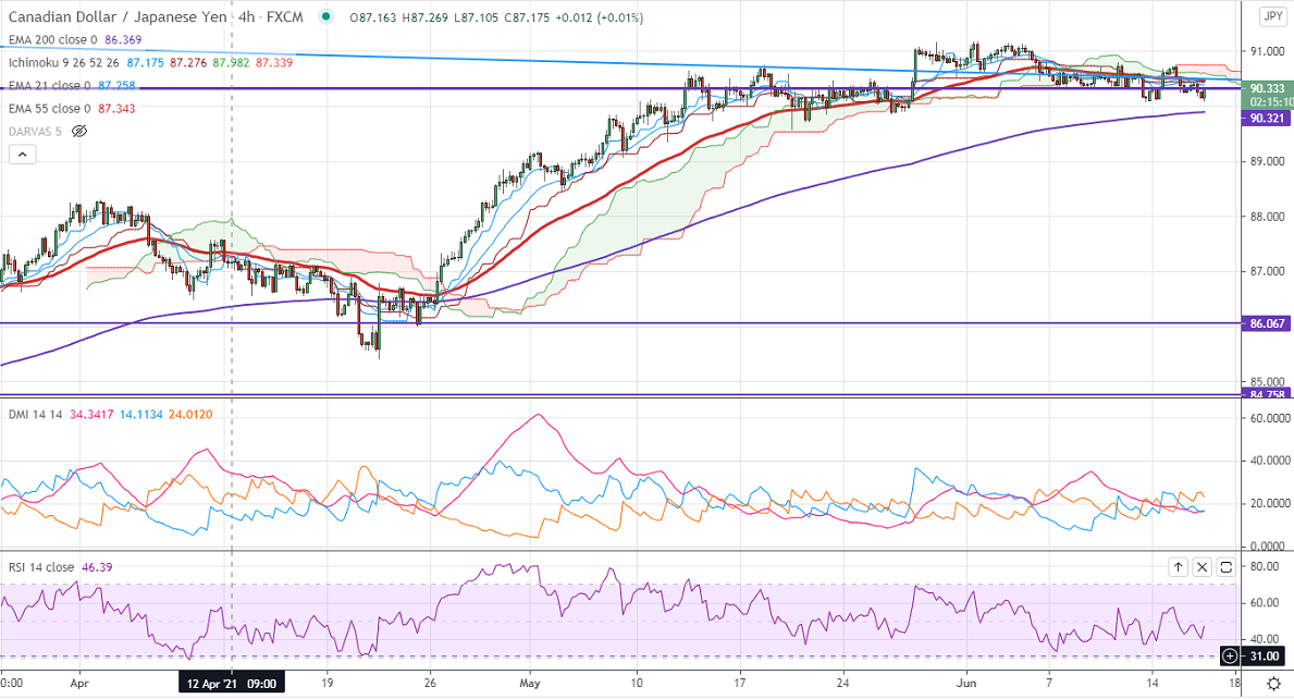 CADJPY is trading weak for the past two weeks and lost more than 100 pips on minor weakness in the Canadian dollar. The Canadian dollar has halted its 6 months of weakness and shown a minor pullback against the US dollar. USDCAD recovered more than 200 pips from a low of 1.2000. The Canada May CPI came at 3.6% vs 3.5% y/y expected. The minor weakness in the yen is preventing the pair from downside. The minor jump in yen is putting pressure on this pair at higher levels. USDJPY is declining after a sudden jump above 110. Any breach below 109.17 (200-4H MA) confirms further bearishness. The intraday trend of CADJPY is bullish as long as support 90.30 holds.