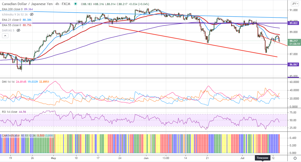 CADJPY has taken support near trend line support and surged more than 150 pips on minor weakness in Yen. USDJPY formed temporary bottom around 109.53 and shown minor pullback till 110.44. The jump in US bond yield is preventing further upside. The Canadian dollar is trading weak against the USD for the past 1-1/2 months and has lost more than 500 pips on board-based US dollar buying. The intraday trend of CADJPY is bearish as long as resistance 88.80 holds.