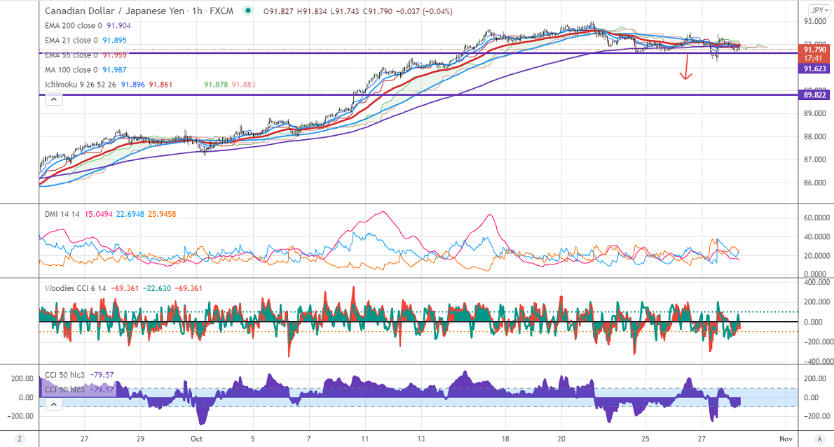 CADJPY regained after the Bank of Canada monetary policy. The central bank has kept its rates unchanged and ended its quantitative easing. It has moved up its timeline to the "middle quarters of 2022" for a rate hike. The Canadian dollar gained sharply against the US dollar after the hawkish stance by BOC. The intraday trend of CADJPY is bearish as long as resistance 92.50 holds.