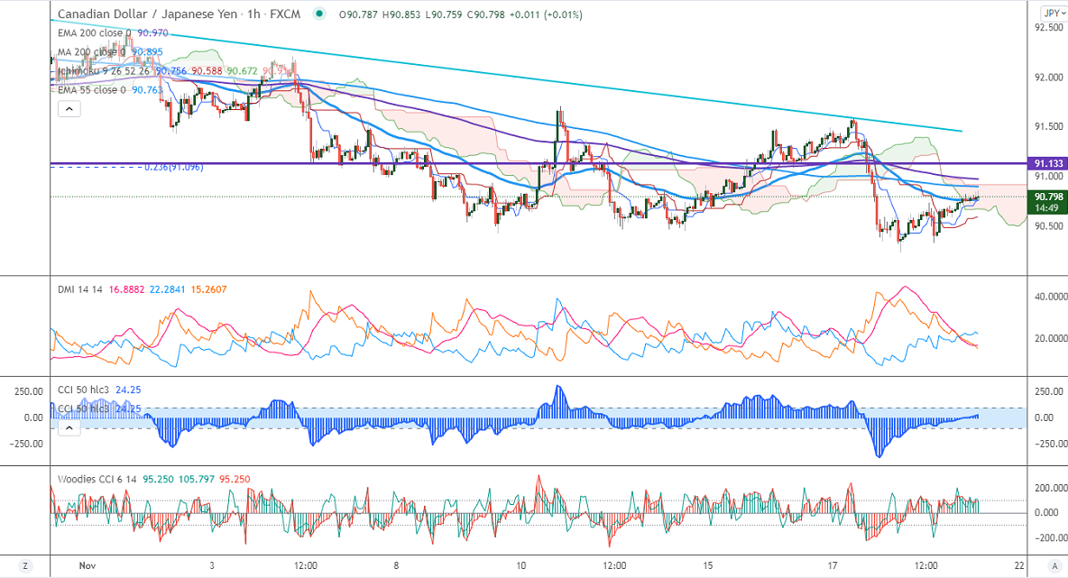 CADJPY regained sharply after hitting a low of 90.22. The pair was one of the worst performers in the past four weeks on Canadian dollar weakness. The rise in inflation has increased the chance of rate hikes by the Bank of Canada. The intraday trend of CADJPY is neutral as long as resistance 91 holds.