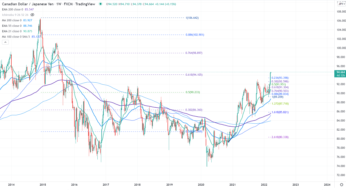 CADJPY continues to trade higher for a third consecutive week and hits a fresh 6-1/2 year high. The board-based weakness in yen against all majors supporting pair at lower levels. The bullish trend in the Canadian dollar is due to a jump in crude oil price pushes the prices further higher. Canada's retail sales jumped by 3.2% in Jan compared to a forecast of 2.4%. CADJPY hits an intraday high of 94.69 and is currently trading around 94.68.