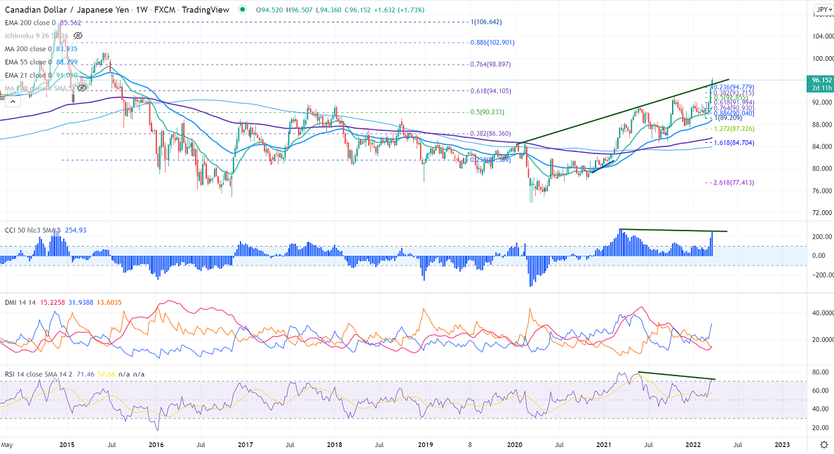 CADJPY trading higher for a third consecutive week and jumped nearly 700 pips on weak yen. The bullish trend in the Canadian dollar due to the surge in crude oil prices also supports the pair. It hits a high of 96.50 yesterday and is currently trading around 96.153.