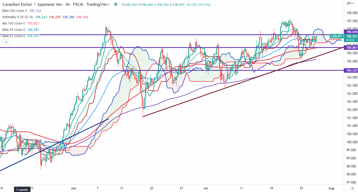 CADJPY gained more than 150 pips after hitting a low of 105.06 on the strong Canadian dollar. Markets eye the US fed monetary policy for further direction. The Canadian dollar was one the best performer in the past month as BOC surprised markets with a 100 bpbs rate hike. The intraday trend of CADJPY is bullish as long as support 105.80 holds.