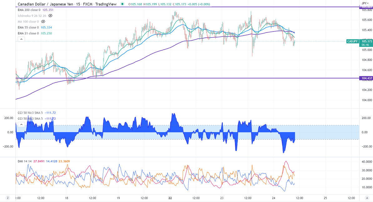 200 EMA (105.35). Any break above 105.35 will take the pair to 105.80/106.50. CADJPY hits an intraday high of 105.08 and is currently trading around 105.12.