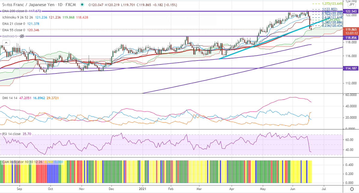 CHF/JPY continues to trade lower for third consecutive days and lost more than 250 pips on Swiss franc weakness. The Swiss franc has halted its bullish trend and trading weak against the USD for the past week. USDCHF recovered more than 250 pips from a low of 0.89303. The minor strength in the yen is further dragging CHFJPY down. USDJPY is holding above 110 levels after BOJ has extended its pandemic –relief program by another six months.