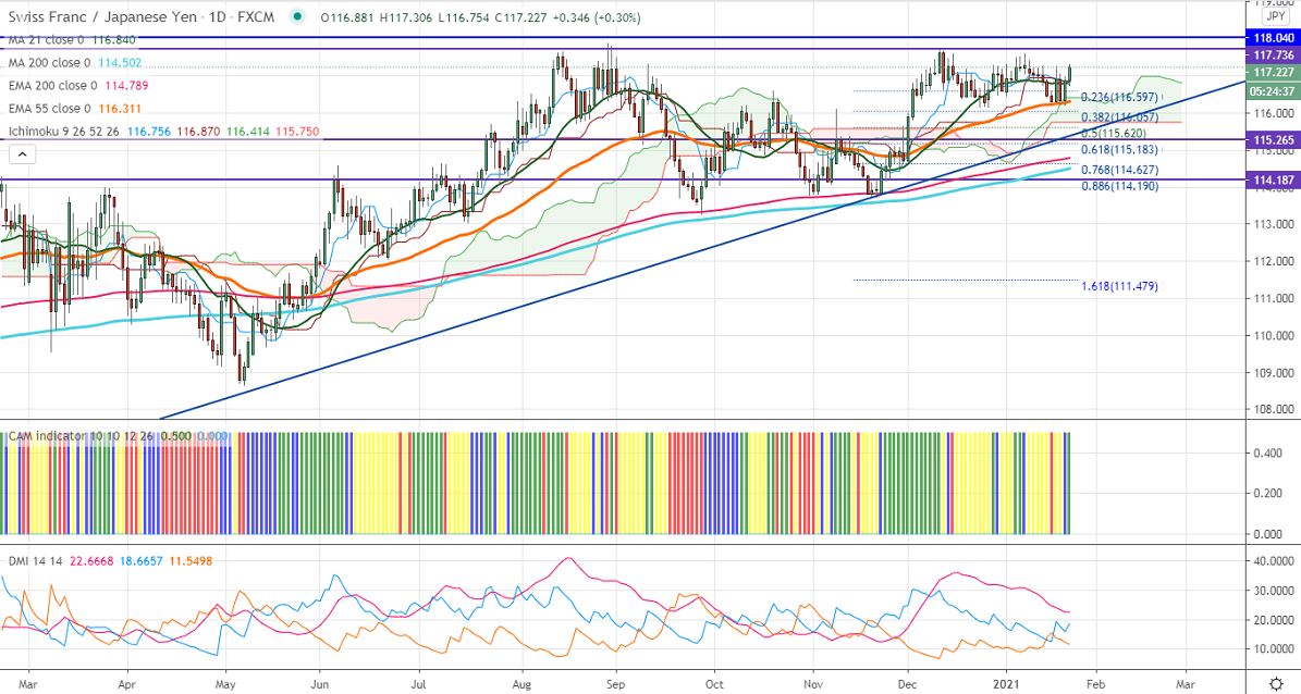 CHF/JPY recovered more than 100 pips from a low of 116.207. The pair has taken support near 55- day EMA, any significant bearishness only below 116.25. The strength in Swiss franc on increasing demand for Safe-haven assets. USDJPY is holding above 200-H MA, jump to 104.40 is possible. The intraday trend of CHFJPY remains bullish as long as support 116.25 holds.