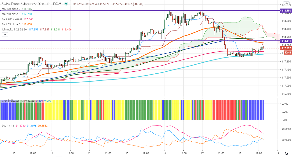 The pair's strong resistance is at 119, violation above will take to the next level 120/120.60. On the lower side, near-term support is around 117.69, and any indicative break below targets 117.30/116.91.