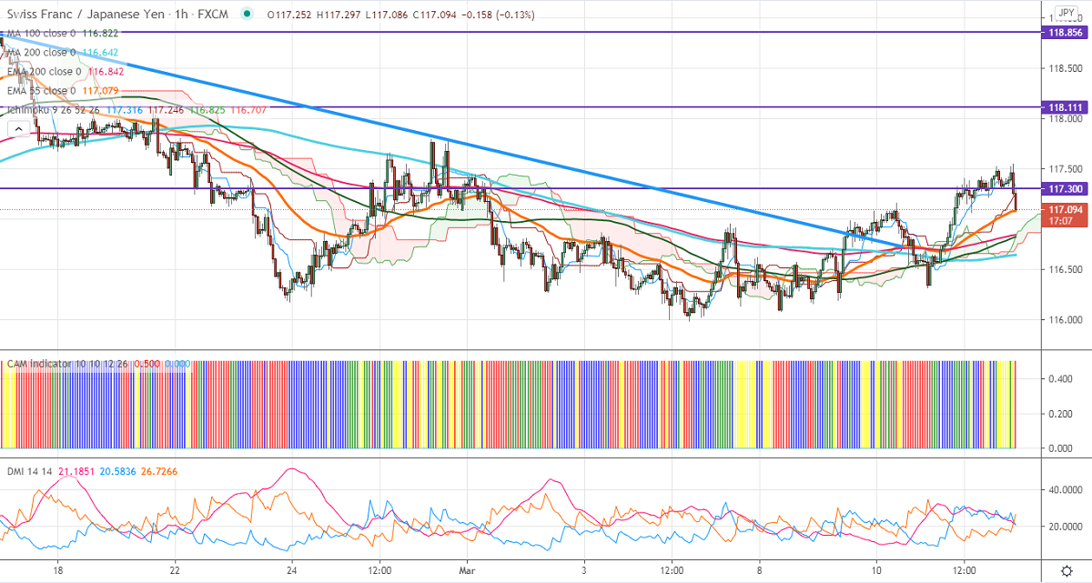 CHF/JPY has shown a minor selling after hitting a high of 117.54. The pair is trading weak despite a major sell-off in the yen. The surge in US bond yield is supporting USDJPY at lower levels. USDJPY hits a multi-month high and trading above 200-W MA. A jump till 110 likely. The intraday trend of CHFJPY remains bearish as long as resistance 117.85 holds.