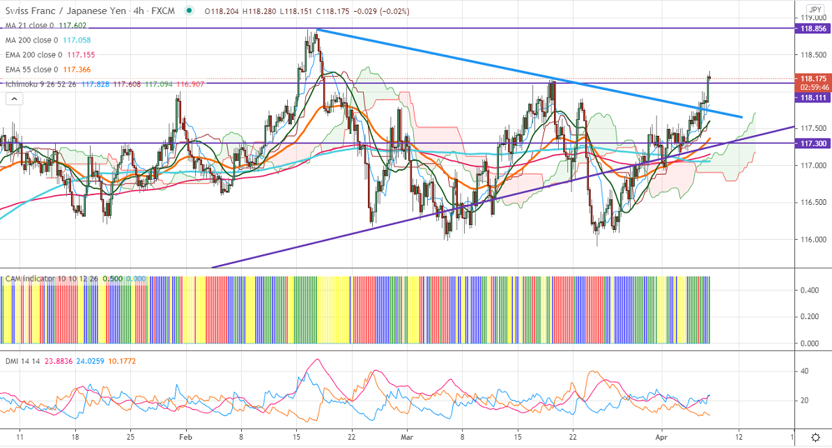 As per our analysis, CHF/JPY continues to trade higher for 3rd consecutive days. The pair surged more than 100 pips on the strong Swiss franc. USDCHF has hated its 1-1/2 month of the bullish trend and formed a temporary top around 0.94725. The minor sell-off in the US 10-year bond yield is dragging the US dollar down. The yen recovered sharply against the USD, any break below 109.50 confirms further bearishness. The intraday trend of CHFJPY remains slightly bullish as long as support 117.60 holds.