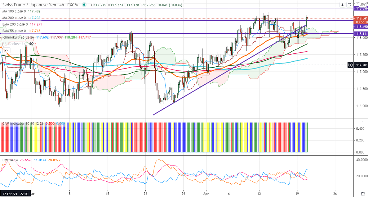 CHF/JPY has shown a nice recovery of more than 50 pips from yesterday's low of 117.98. The jump in the Swiss franc is supporting the pair at lower levels. USDCHF hits one month low on broad-based US dollar selling. The slight weakness in yen due to minor pullback in US bond yields is also preventing CHFJPY from further decline. USDJPY is facing strong support at 108 and minor bearish continuation only below that level. The intraday trend of CHFJPY is bullish as long as supports 117.60.