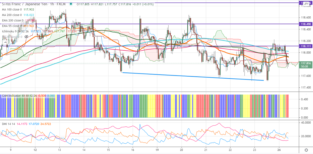 The pair is struggling to close above 200-H MA 118.02. this confirms intraday weakness, a dip to 117.50 is possible. Any break below 117.35 confirms minor weakness, and a dip till 116.90/116.09 likely. On the higher side, near-term resistance is around 118.02, and any indicative break above targets 118.25/118.75.