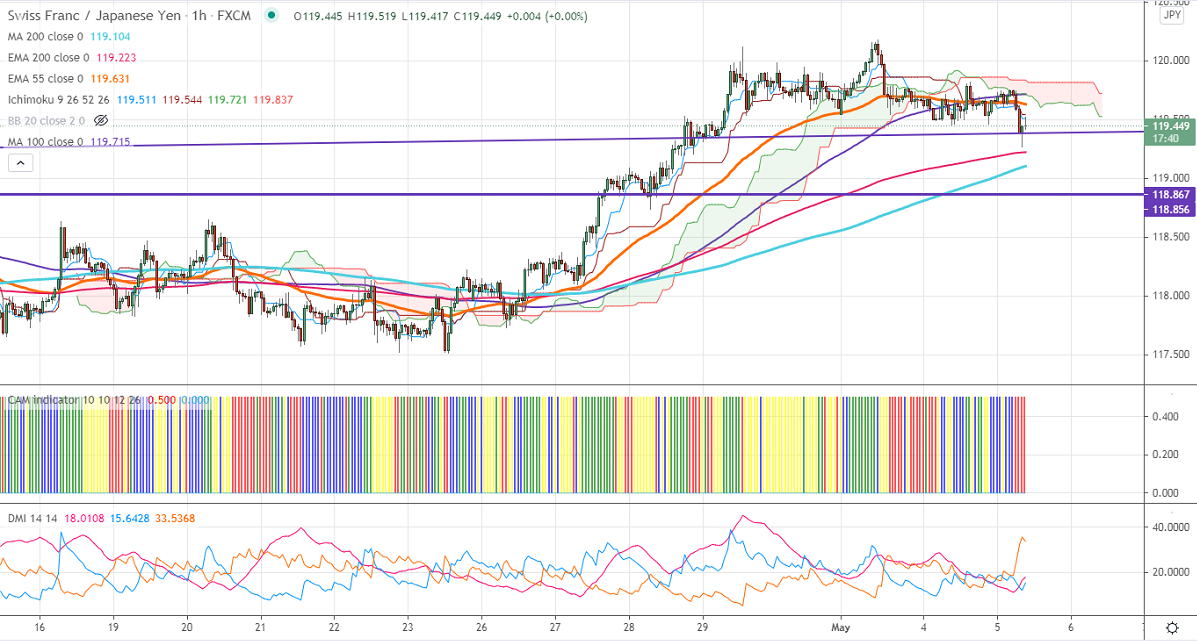 The pair is holding well below hourly Tenken-Sen and Kijun-Sen and 100 MA. The pair should break below 119 for further bearishness. A dip till 118.60/117.95/116 likely. On the higher side, near-term resistance is around 119.75. Any break below targets 120/120.25/120.75.