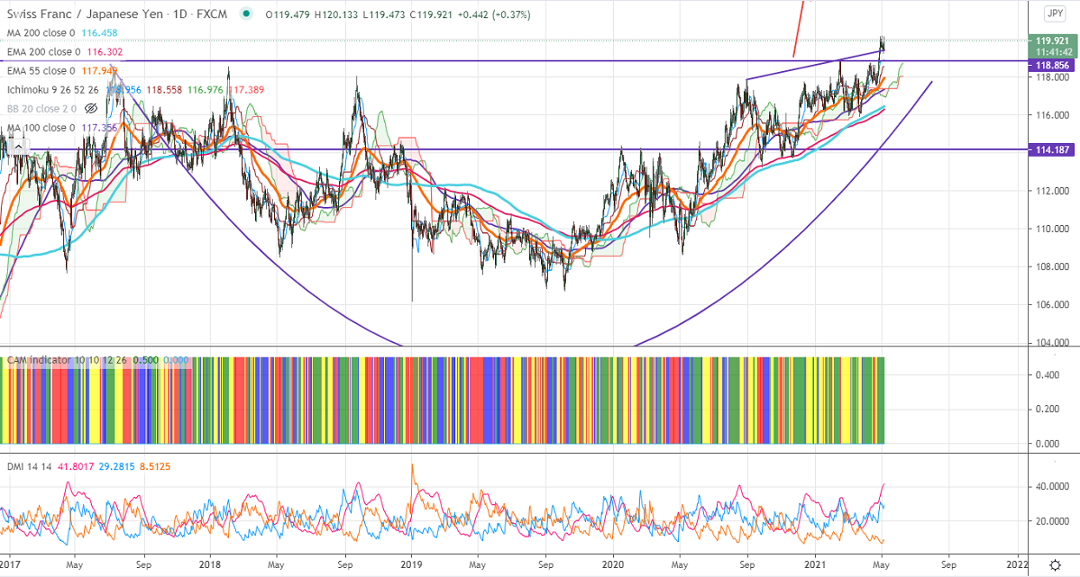 CHF/JPY has taken support near 200-H MA and surged more than 80 pips on the strong Swiss franc. The Swiss franc is trading higher against all majors, especially vs US dollar. USDCHF continues to trade weak for a fourth consecutive week and lost more than 300 pips. CHJPY was one of the best performers the previous week and surged more than 200 pips from a low of 117.73. The weakness in the yen also supporting the pair at lower levels. USDJPY is holding above 200-W MA. Any breach above 109.70 confirms intraday bullishness. The intraday trend of CHFJPY is bullish as long as support 119 holds.
