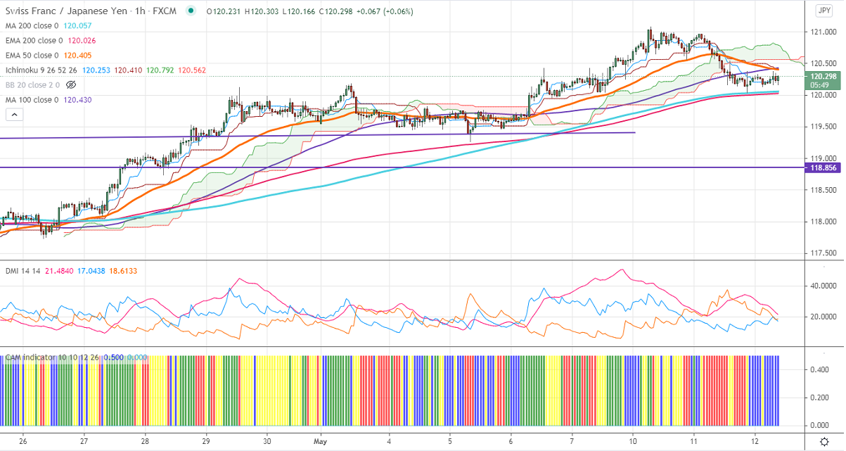 CHF/JPY has taken support near 200-H MA and shown a minor jump. The pair halted its 1-1/2 months bullish trend and declined slightly from a temporary top of 121.07. The minor strength in the Japanese Yen due to sharp in global equity markets and surge in Coronavirus cases in Japan has increased demand for safe-haven assets. USDCHF showed a minor pullback after hitting a 2-1/2 month low. It should break above 0.9075 (200- day MA) for further bullishness. USDJPY paired some of the gains made today. Minor bullish continuation only above 109.05. The intraday trend of CHFJPY is bullish as long as support 120 holds.