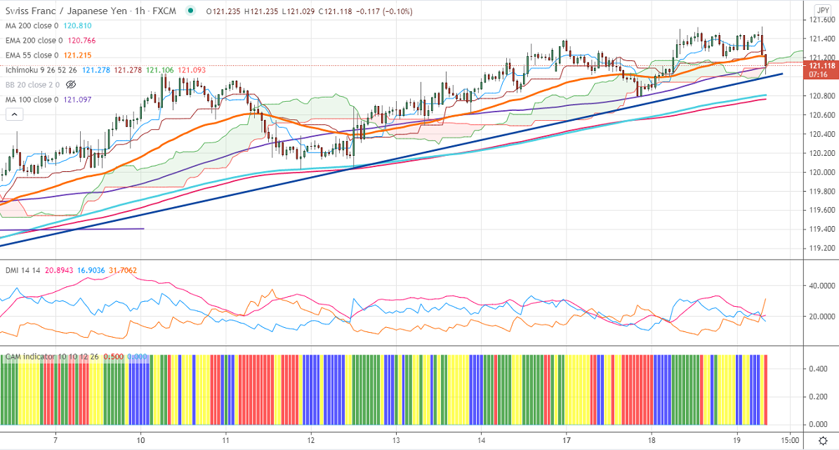 CHF/JPY has halted its four weeks of the bearish trend and lost more than 40 pips. The minor pullback in the Japanese yen on declining US bond yields puts pressure on this pair at higher levels. USDCHF recovered slightly after a decline till 0.89603. USDJPY formed double bottom near 108.80 and shown a minor pullback. Any breach above 109.12 confirms intraday bullishness. The intraday trend of CHFJPY is bullish as long as support 120.95 holds.