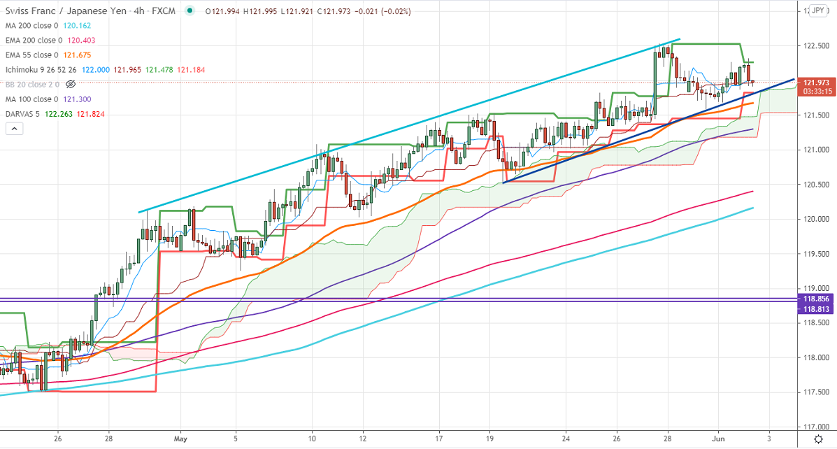 CHF/JPY has once again declined after a minor jump above 122 level. The Swiss franc has halted its bullish trend against the USD after a major sell-off. Any surge pat 0.9030 confirms intraday bullishness. The slight pullback in USDJPY is putting pressure on CHFJPY at higher levels. The pair was one of the best performers this year and jumped more than 500 pips due to the board–based yen selling. USDJPY is holding well above 200-WMA, any breach above 110.20 targets 111. The intraday trend of CHFJPY is bullish as long as support 121.45 holds.