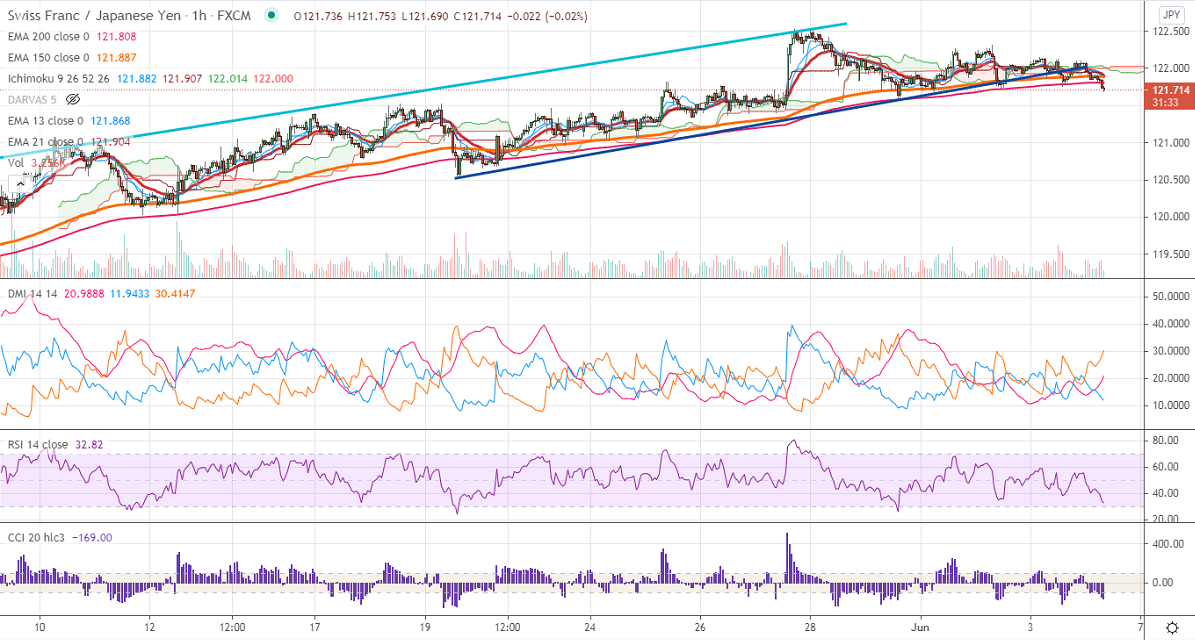 CHF/JPY is declining once again slightly after a pullback above 122 level. The pair has formed a temporary top around 122.52 and shown a minor sell-off. The board-based Swiss franc selling is putting pressure on this pair at higher levels. USDCHF broken significant resistance 0.9045 after a long consolidation. The major selling in yen is preventing the pair from further sell-off. USDJPY is holding well above 110, a jump till 111 is possible. The intraday trend of CHFJPY is bearish as long as resistance 122.50 holds.