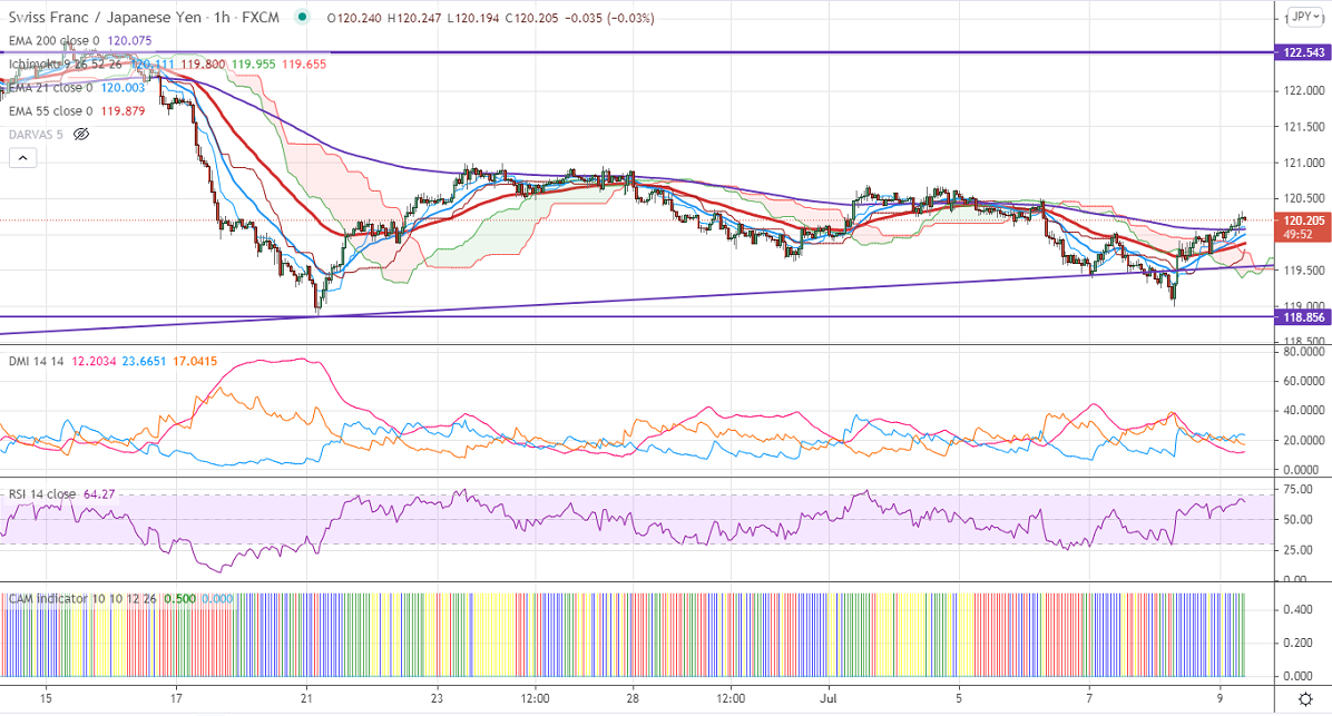 The pair is trading above 1-hour Tenken-Sen, Kijun-Sen, and cloud. The near-term resistance is around 121. Any violation above targets 122/123. The immediate support is around 120. Any decline below that level will take the pair to 119.60/118.80/118.50.