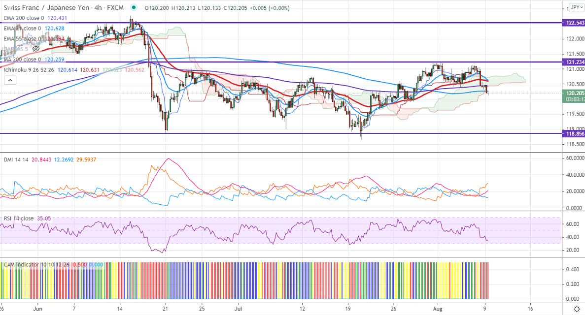 CHFJPY has formed a double top near 121.20 and shown a minor selling. The board-based weakness in Swiss franc against USD after upbeat US jobs data. USDCHF is holding above 0.9150 and hits 2- week high. Any close above 0.91650 confirms further trend continuation. The minor sell-off in the Japanese Yen amid rising US bond yields is preventing further downside of this pair. CHFJPY hits an intraday low of 120.13 and is currently trading around 120.19.
