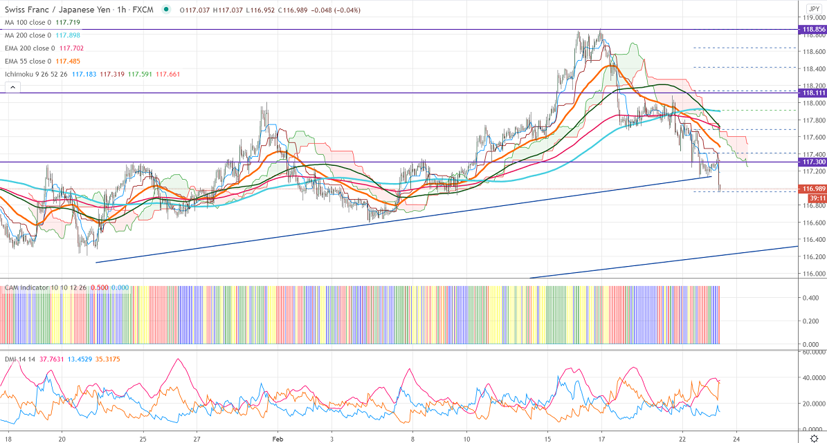 CHF/JPY is trading weak for fourth consecutive days and lost more than 180 pips on the weak Swiss franc. USDCHF recovered more than 50 pips from a low of 0.89475. The strength in the Japanese yen despite a surge in the US 10-year yield is also putting pressure on this pair.USDJPY is trading below 105, a dip till 104.40. The intraday trend of CHFJPY remains bearish as long as resistance 117.88 holds.