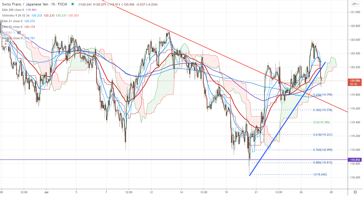 CHFJPY has declined after a minor pullback to 120.60. The strength in the yen is putting pressure on the pair at higher levels. USDJPY started to show a minor weakness on safe-haven demand due to coronavirus. The sell-off in US bond yields also supporting the yen.CHFJPY hits an intraday low of 119.93 and is currently trading around 119.96.