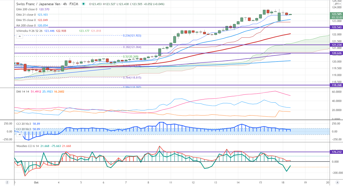CHFJPY is trading slightly lower after hitting a 5-1/2 year high. The pair was one of the best performers this month, jumped more than 450 pips on the weak Japanese Yen. USDJPY hits three years high on surging US treasury yield and upbeat market sentiment. CHFJPY hits an intraday low of 123.40 and is currently trading around 123.507.