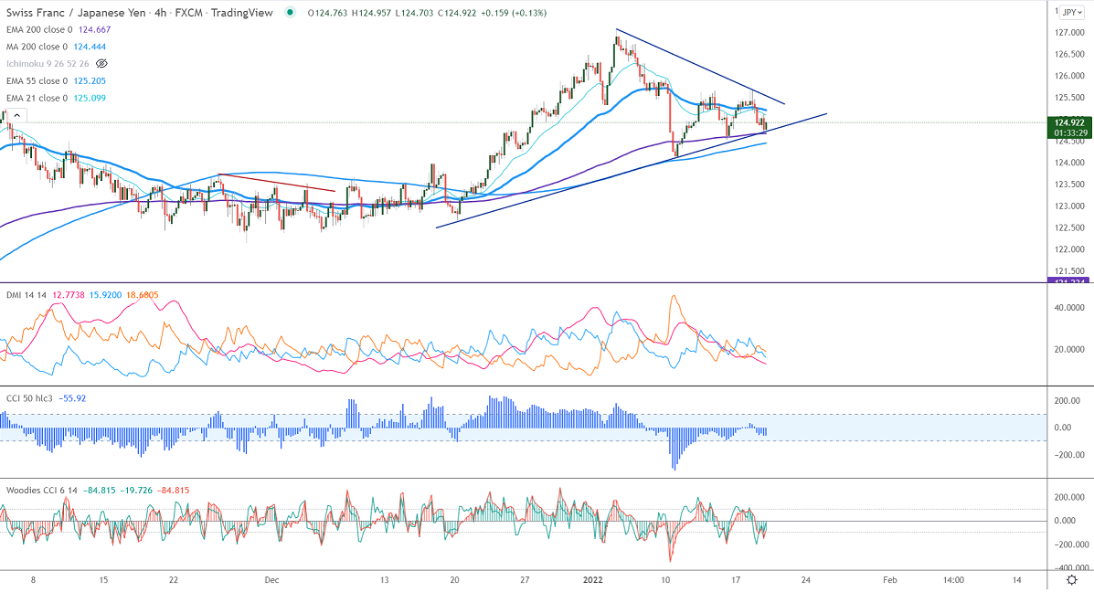 CHFJPY took support near the trend line and showed a minor pullback. The pair was one of the worst performers this month and lost nearly 200 pips on the weak Swiss franc. The Japanese yen is gaining momentum despite strong US treasury yields against the USD. Any breach below 113.45 confirms bearish continuation. CHFJPY hits an intraday high of 124.95 and is currently trading around 124.90.