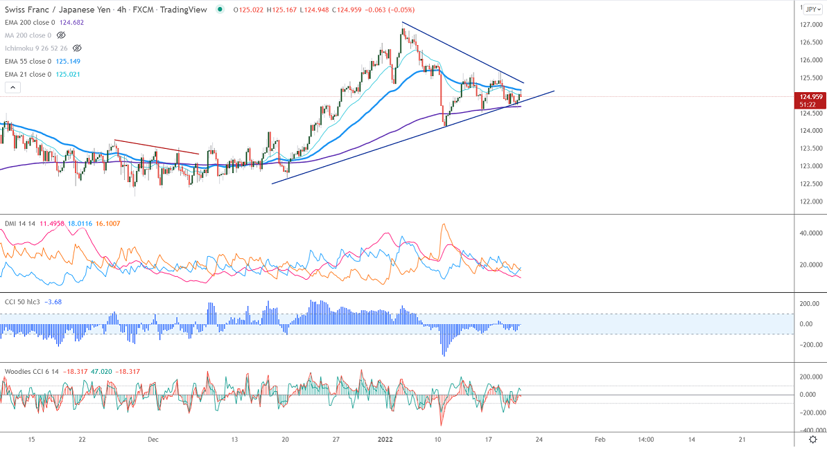 As per our analysis, CHFJPY has taken support near the trend line and shown a pullback above 125. The pair is consolidating in a narrow range between 125.67 and 124.62 for the past four days. The Japanese yen lost more than 50 pips against the USD as US treasury yields rise. Any breach above 115 confirms bullish continuation. CHFJPY hits an intraday high of 125.16 and is currently trading around 125.04.