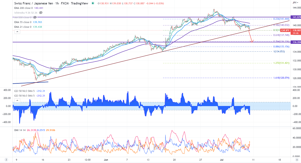 CHFJPY breaks significant trend line support and holds below that level. The Japanese yen gained strength after shooting Japan's ex-PM. The weakness in the Swiss franc against the US dollar on the board-based US dollar also puts pressure on this pair. Technically, in the 4-hour chart the pair trades below short-term ( 21 and 55 EMA) and above the long-term 200- EMA (138.01) moving average. CHFJPY hits an intraday low of 138.37 and is currently trading around 138.80.