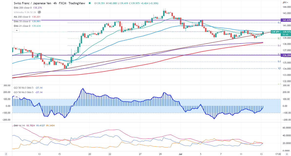 CHFJPY regained above 140 level and hovering around this level. The Japanese yen trade weak on policy divergence between US Fed and BOJ. The minor pullback in the Swiss franc against the US dollar on the board-based US dollar also puts pressure on this pair. Technically, in the 4-hour chart the pair trades above short-term ( 21 and 55 EMA) and the long-term 200- EMA (138.25). CHFJPY hits an intraday high of 140.08 and is currently trading around 140.05.