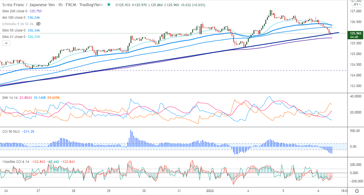 CHGJPY is trading below 21 and 55 EMA (126.36 and 126.34) and slightly above 200-MA and EMA in the hourly chart.
