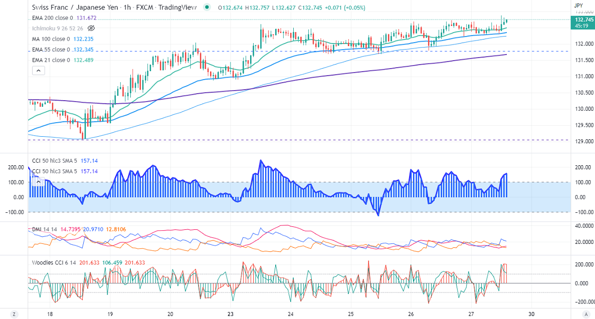 CHFJPY is trading above 200 and 100 4H EMA (131.52 and 131) and confirms a bullish trend.