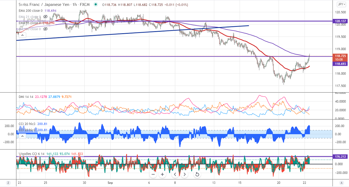 CHFJPY recovered more than 70 pips from minor bottom 118.04 on board-based Swiss franc strength. The global stock markets crash due to the Chinese Evergrande debt crisis has increased demand for Safe-haven assets like the Swiss franc. It hits an intraday high of 118.80 and is currently trading around 118.70.