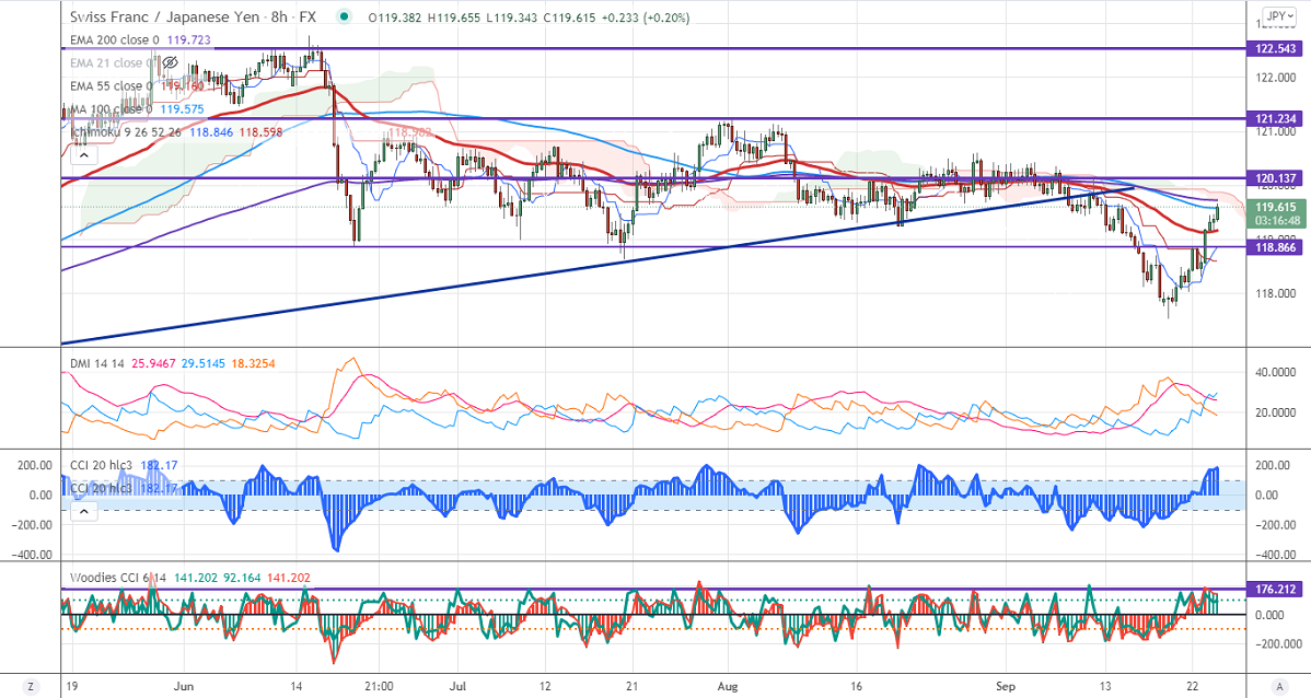 As per our analysis, CHFJPY continues to trade higher for fourth consecutive days on board-based Japanese yen selling. The Swiss franc gained slightly after the Swiss National Bank policy meeting. It has kept its rates unchanged at -0.75% and reiterated its willingness to intervene in the forex markets if necessary. It hits an intraday high of 119.615 and is currently trading around 119.497.
