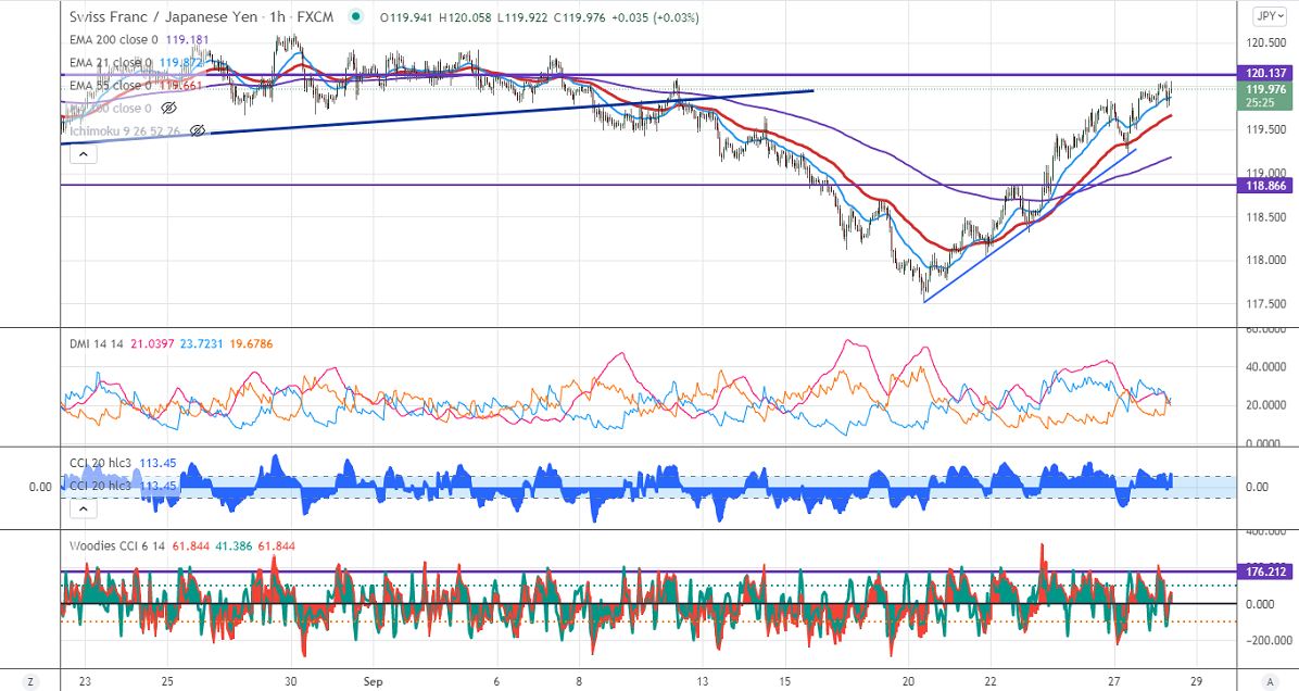 CHFJPY continues to trade higher for the fourth consecutive day and hits two weeks highs on weak yen. The risk-on-mood in global markets has decreased demand for safe-haven assets like yen, gold. The minor weakness in the Swiss franc against the US dollar is putting pressure on the pair at higher levels. It hits an intraday low of 119.98 and is currently trading around 119.976.