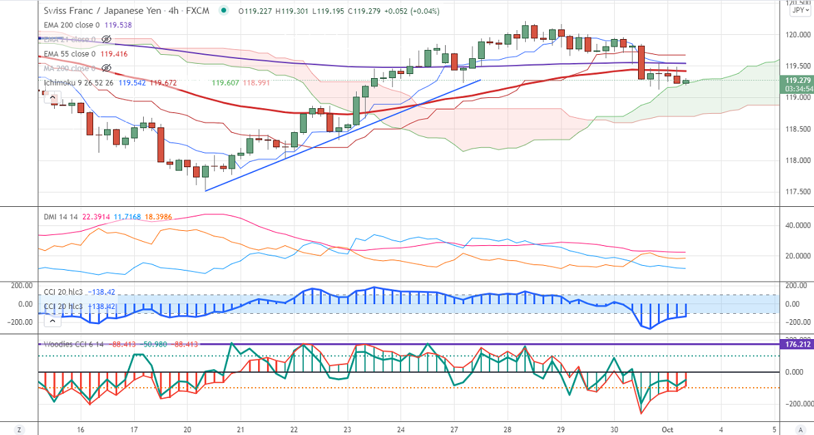 CHFJPY continues to trade lower for third continuous days on a minor pullback in yen. The risk aversion in global markets has increased for safe-haven assets like gold and yen. The Swiss franc has halted its weak trend against the US dollar is preventing the pair from major sell-off. CHFJPY hits an intraday low of 119.98 and is currently trading around 119.976.