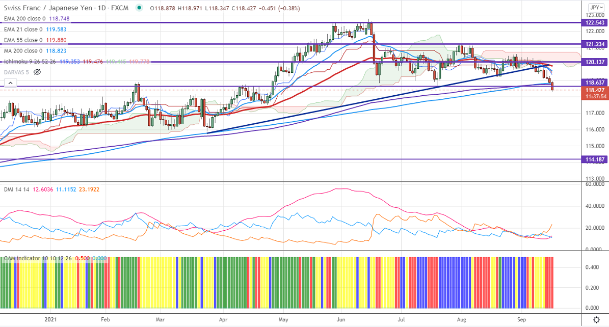 CHFJPY is trading weak for the past 10 days on board–based Japanese yen strength. The pair has broken significant support 118.81 (200-day MA) after a long consolidation. It hits an intraday high of 118.36 and is currently trading around 118.38.