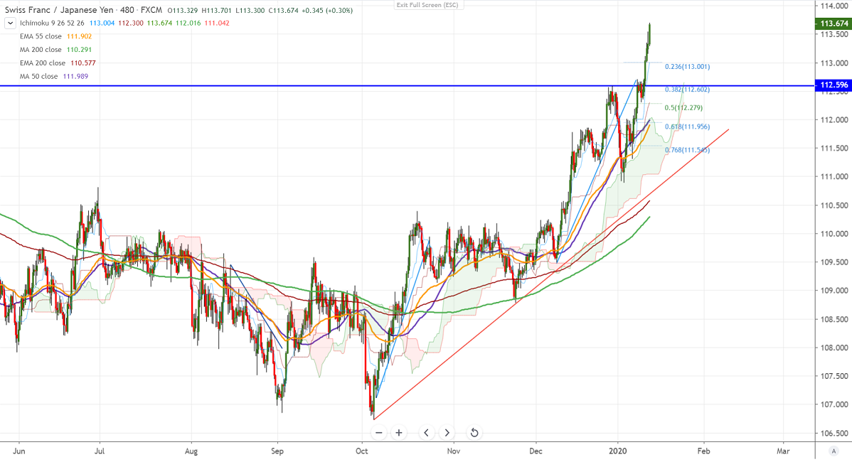 As per our analysis, CHFJPY continues to trade higher and jumped more than 100 pips this week. It has recovered sharply more than 250 pips from minor bottom 110.89. The phase one trade deal to be signed tomorrow and the US has removed China from currency manipulators list is adding pressure to Safe-haven assets like yen and gold. It hits a high of 113.60 and is currently trading around 113.57.