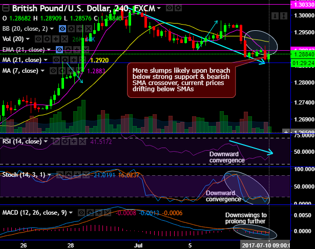 On the other hand, lagging oscillators are also in sync with the same bearish stance offered by the leading indicators. MACD indicates the price slumps to prolong further (refer 4H charts), while 7DMA has crossed below 21DMA which is again a bearish signal.