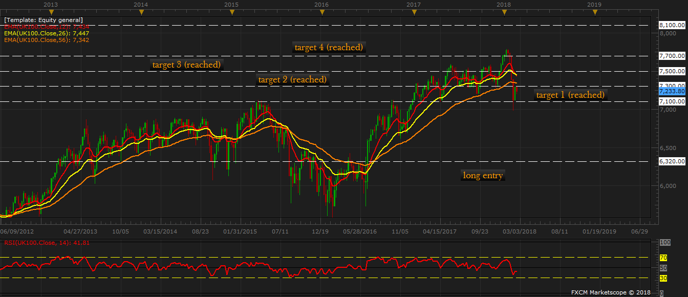 While FTSE has reached most of our targets (7100, 7300, 7500, and 7700), it has failed to reach our final targets at 8100 area in the current run. The massive selloffs that rocked the global stock markets have pushed the FTSE100 lower, which is currently trading at 7240 (UK100).