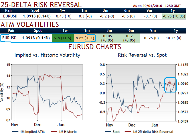 The delta risk reversal indicates hedging interest seen in EURUSD upside risks and accordingly volumes in overpriced calls have been piling up and it would likely remain the same for next 1-3 months or so. You can also observe the convergence between historic and implied vols as well as the risk reversals curve moving in sync with spot FX curve.