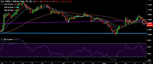 We prefer to take short position on USD/CNY only below 6.96, stop loss at 6.9920 and target of 6.9210.