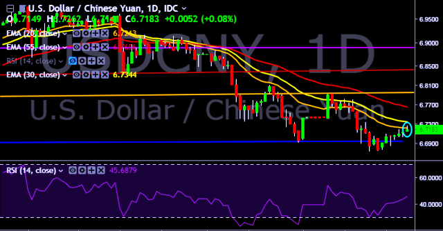 We prefer to take long position on USD/CNY around 6.7150, stop loss at 6.7050 and target of 6.73.