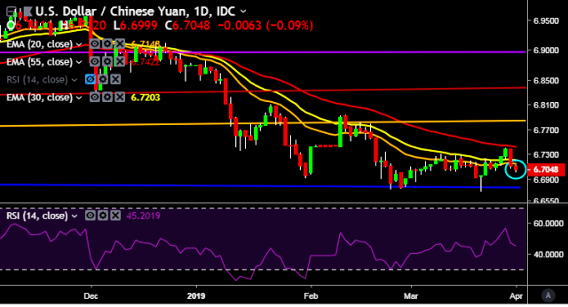 We prefer to take short position on USD/CNY around 6.7100, stop loss at 6.7422 and target of 6.6853/6.6650.