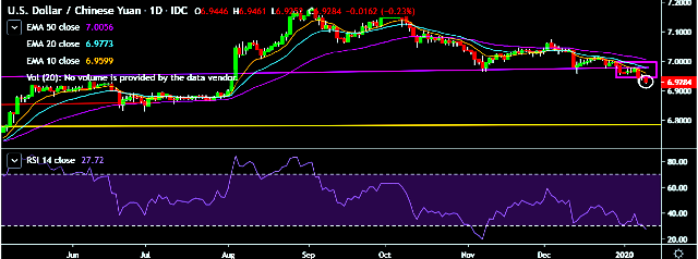 - Alternatively, a daily close below 6.9446 will drag the parity down towards key supports at 6.9013, 6.88 and 6.8662 marks respectively.