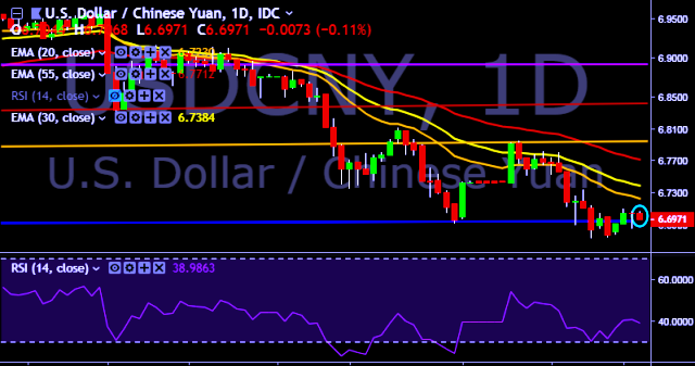 We prefer to take short position on USD/CNY around 6.70, stop loss at 6.71 and target of 6.6750.