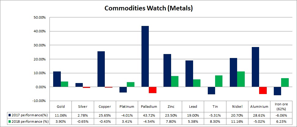 - So far in 2018, Nickel has been the best performer with 11.2 percent gains, followed by Tin (8.3 percent), Zinc (7.8 percent), Iron ore (6.2 percent), Lead (5.4 percent), Gold (3.9 percent), and Platinum (3.4 percent).