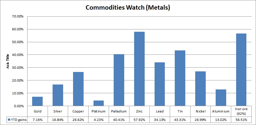 - The best performer in the metal pack has been Zinc which rose 58 percent, followed by Iron ore (56.5 percent), Tin (43.3 percent), Palladium (40.4 percent), and Lead (34.1 percent).