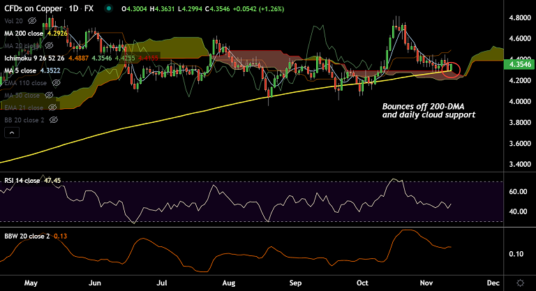 Summary: Copper trades with a neutral bias. Price action is set to extend sideways grind along 200-DMA support.